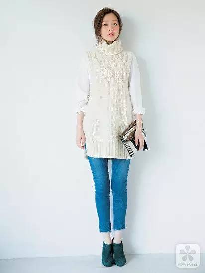 紧身牛仔裤/bit blue 绿色起绒皮脚踝靴/W&M(INDLE CO.,LTD) 大翻领毛衣背心/KIIRA(Khaju Lumine est新宿店) 白色衬衫/SERO for SHIPS、包包/MERCADO GLOBAL(都是SHIPS涉谷店)