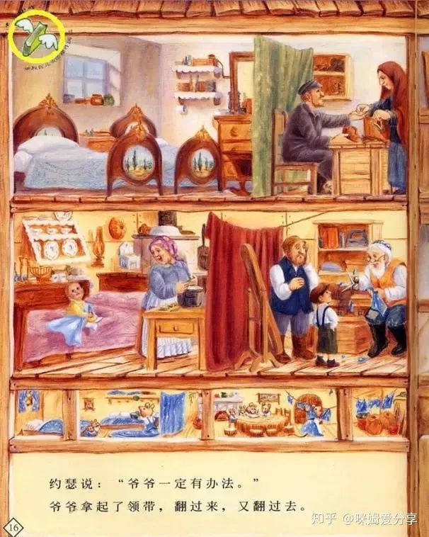 约瑟长大了,妈妈要把毯子扔掉,约瑟拉着心爱的毯子找到爷爷,说爷爷一定有办法。约瑟个子太小了,拉着毯子找爷爷的时候,妈妈怕毯子拖地脏了,后边帮牵着,画面非常生动。