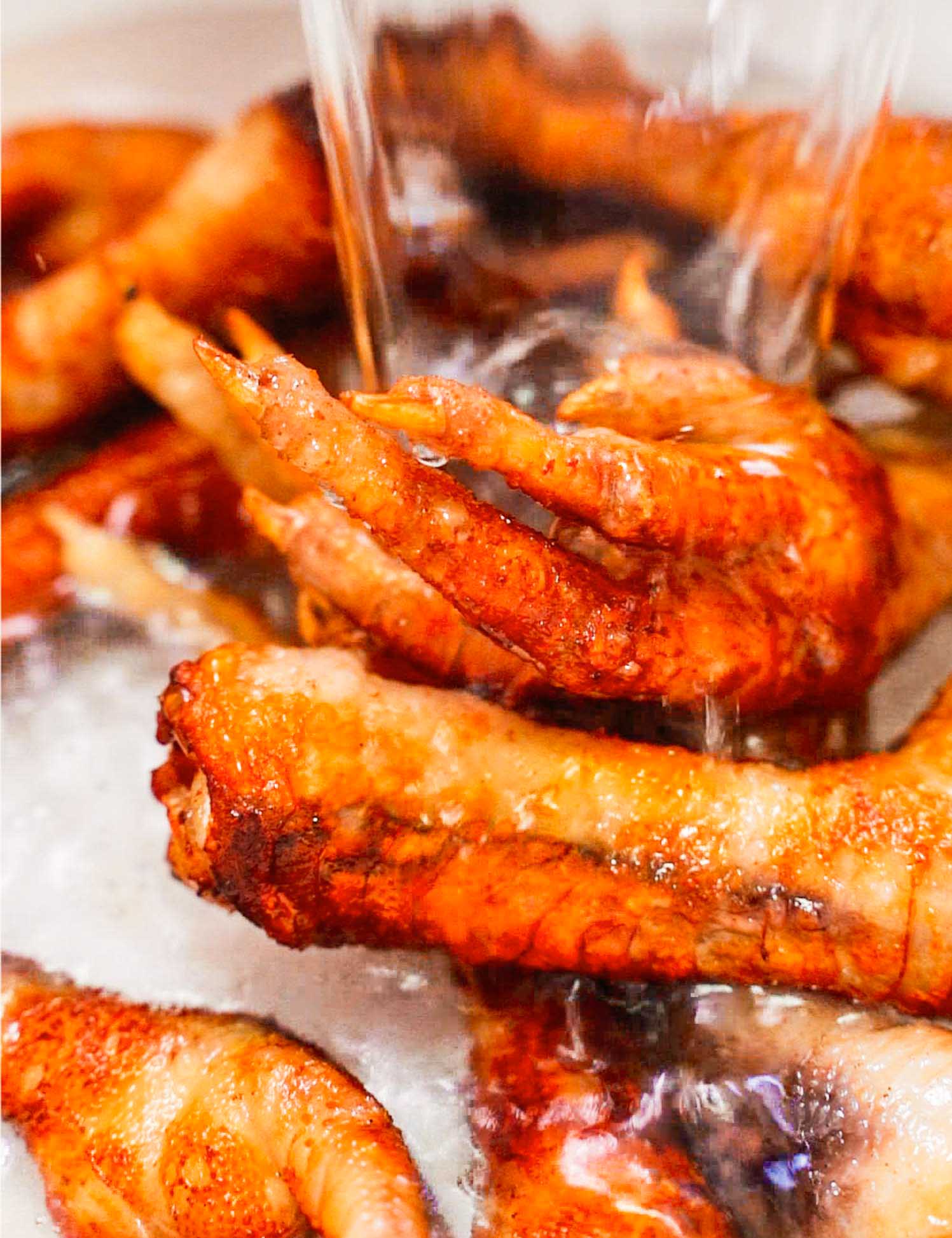先将鸡爪在锅中给它炸至金黄色起焦,捞出之后给它放入冷水中,给它浸泡起皮,时间大概在15分钟,裹成虎皮状。