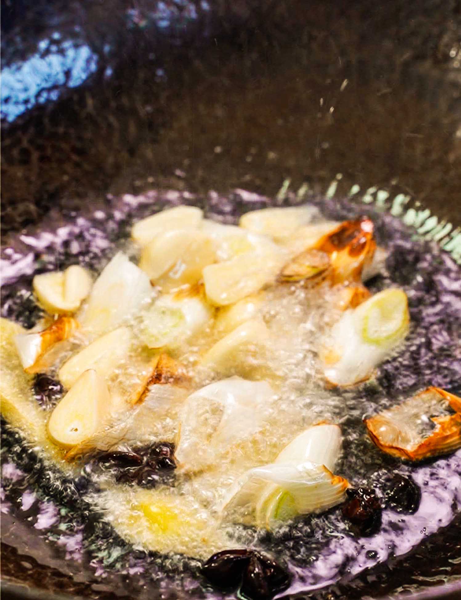 锅中下入葱姜、蒜子、八角在锅中煸炒煸香,