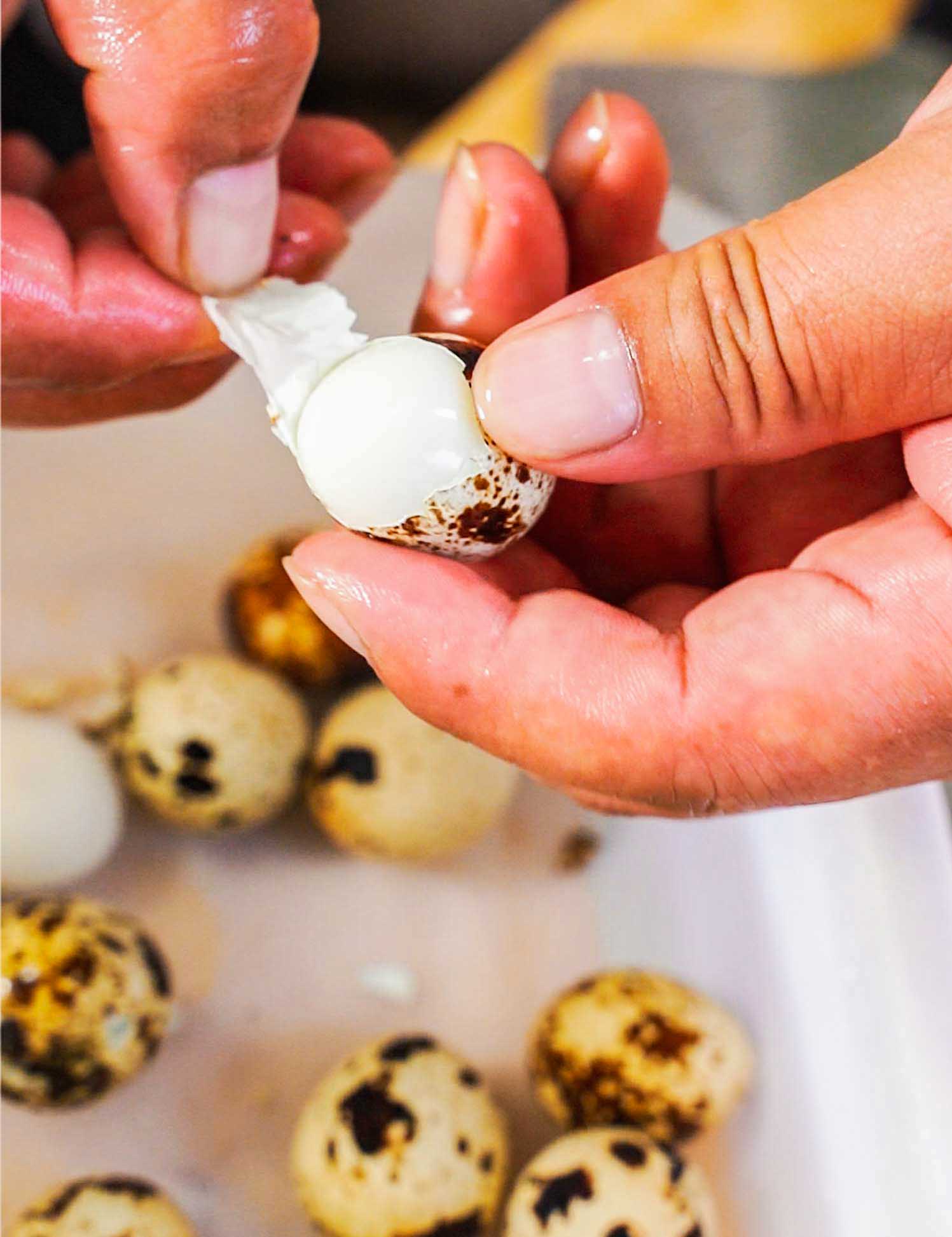 沥干水分备用;将鹌鹑蛋煮好去皮备用。