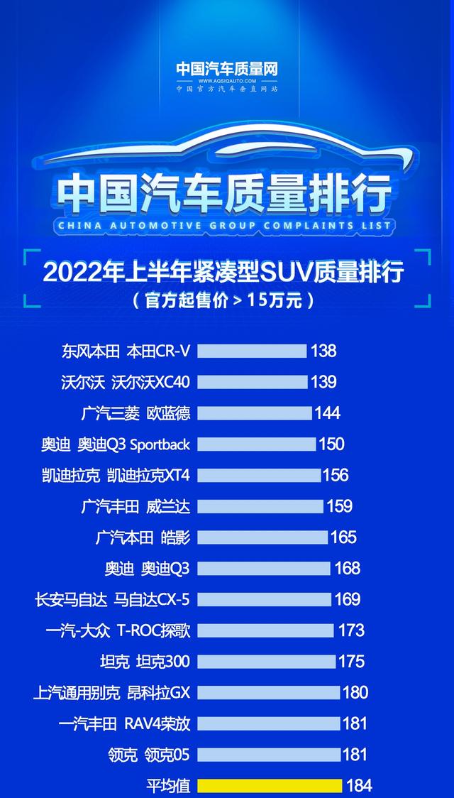 导读:刚刚从“中国汽车质量网”了解到,2022年上半年紧凑型SUV质量最新排行榜公布(官方起售价>15万),本期榜单共有29款车型入榜,其平均值为184分,而质量表现处于平均值之上的车型只有14款。具体方面,本田CR-V实现了卫冕,沃尔沃XC40、凯迪拉克XT4、丰田威兰达、本田皓影和奥迪Q3等车型,都再次入榜前10。大众探歌提升明显,国产SUV坦克300和领克05处于领先,丰田RAV4荣放仅排名13位。而林肯冒险家、大众途岳、奔驰GLA、现代途胜、日产逍客和宝马X1都处于平均值之下,销量惨淡的日产奇骏排名垫底。官宣!紧凑型SUV质量最新排行榜公布:CR-V卫冕,RAV4荣放仅排13!
