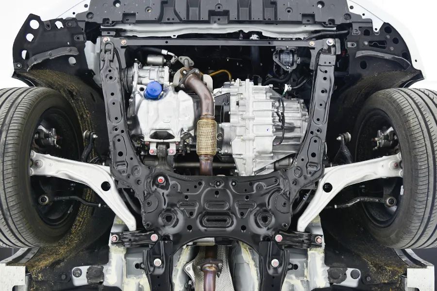 前副车架为双层冲压钢板H形副车架,与老款没什么差别。