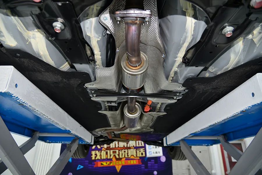 底盘平整度相当不错,有大面积的发动机下护板,大面积的铝合金护板,还预留了机油维护口。