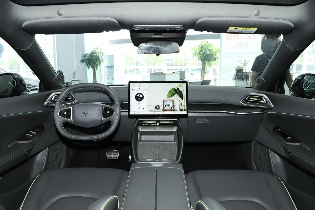 极狐阿尔法S5的内饰则是对称式设计,同样配备了双辐式方向盘,不过它没有配备仪表盘,取而代之的是HUD抬头显示系统,此外它还配备了大尺寸的悬浮式中控屏,科技感很强。