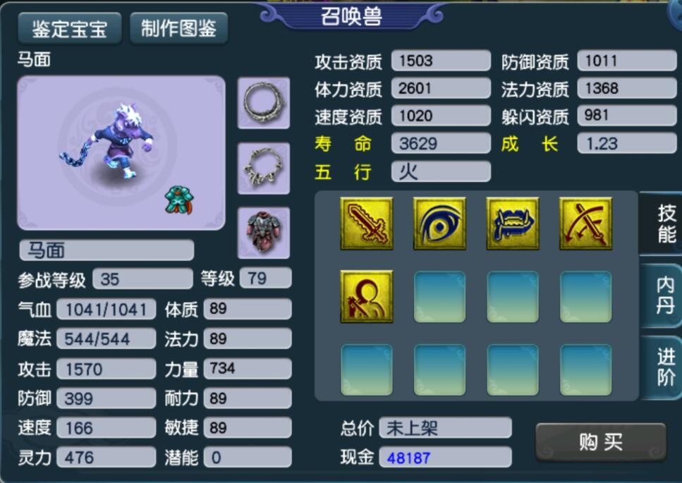 上面是一只拥有着五个技能的马面,这只马面的技能数量刚好就是马面在正常情况下能够达到的技能数量的上限,但是这只马面却是合出来的,因为他的成长达到了1.23,攻击资质也达到了1503,这种召唤兽是可以打书在任务中使用的,但是小编感觉给这种五技能的马面打书特别的亏,因为给这种召唤兽打书最后有可能只会卖书钱,甚至连书钱都卖不回来。