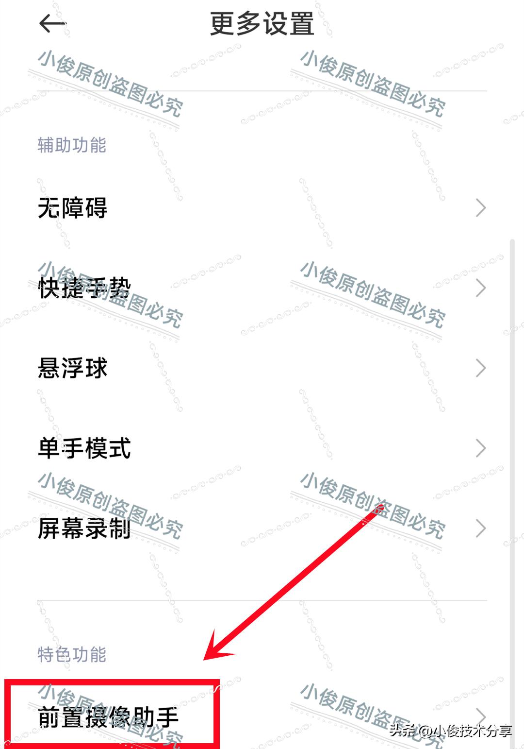 接着在更多设置里面,我们往下滑动,然后就可以看到一个前置摄像助手,那么此时我们要找的就是它了,我们点击把它打开