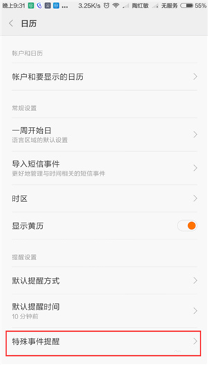 3、点击【特殊事件提醒】,把里面的选项都关了即可。
