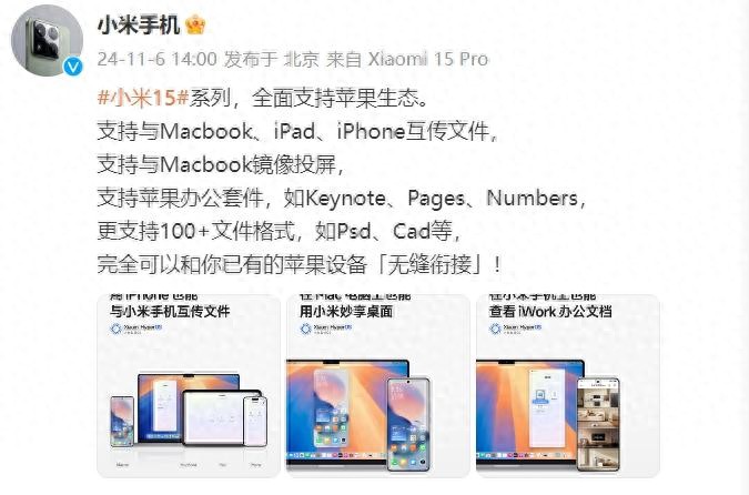 11月6日,小米手机官方微博发布信息:小米15系列,全面支持苹果生态。支持与Macbook、iPad、iPhone互传文件,支持与Macbook镜像投屏,支持苹果办公套件,如Keynote、Pages、Numbers,更支持100+文件格式,如Psd、Cad等,完全可以和你已有的苹果设备无缝衔接。
