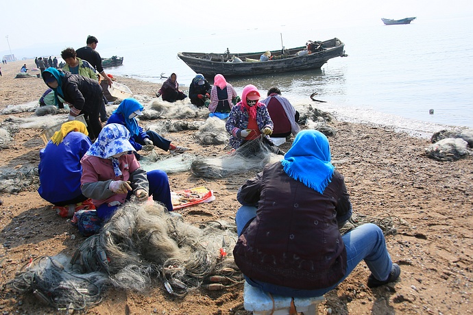 小龙虾捕上来后不像鱼那么好弄,小龙虾的爪子紧紧地抓在网上,得一个个从鱼网上摘下来。所以捕上来后就得让渔女来摘小龙虾。