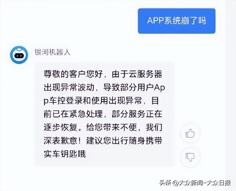 有车主咨询了银河机器人关于“APP系统崩溃”的问题,银河机器人客服在线回应:由于云服务器出现异常波动,导致部分用户APP车控登录和使用出现异常,目前已在紧急处理,部分服务正在逐步恢复。