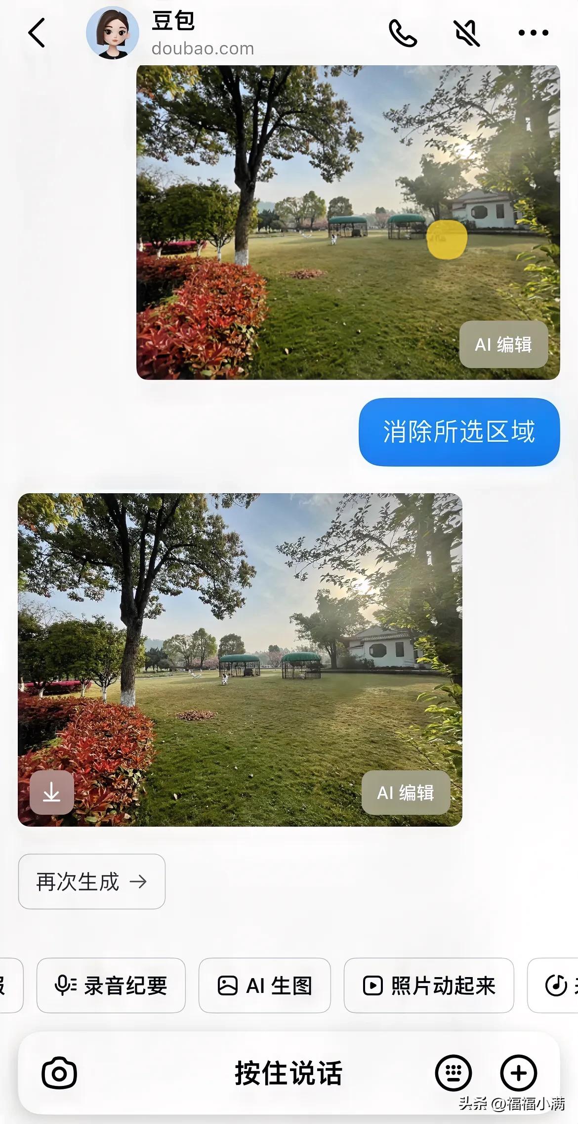 豆包的AI生图功能很强大,消除只是她的一个小小功能,还有扩图,变清晰等,