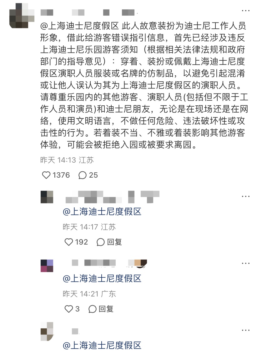 对此,迪士尼官方客服表示:假扮工作人员的行为在迪士尼是禁止的,如看见此类行为可以向游客中心或就近找演职人员进行反馈处理。