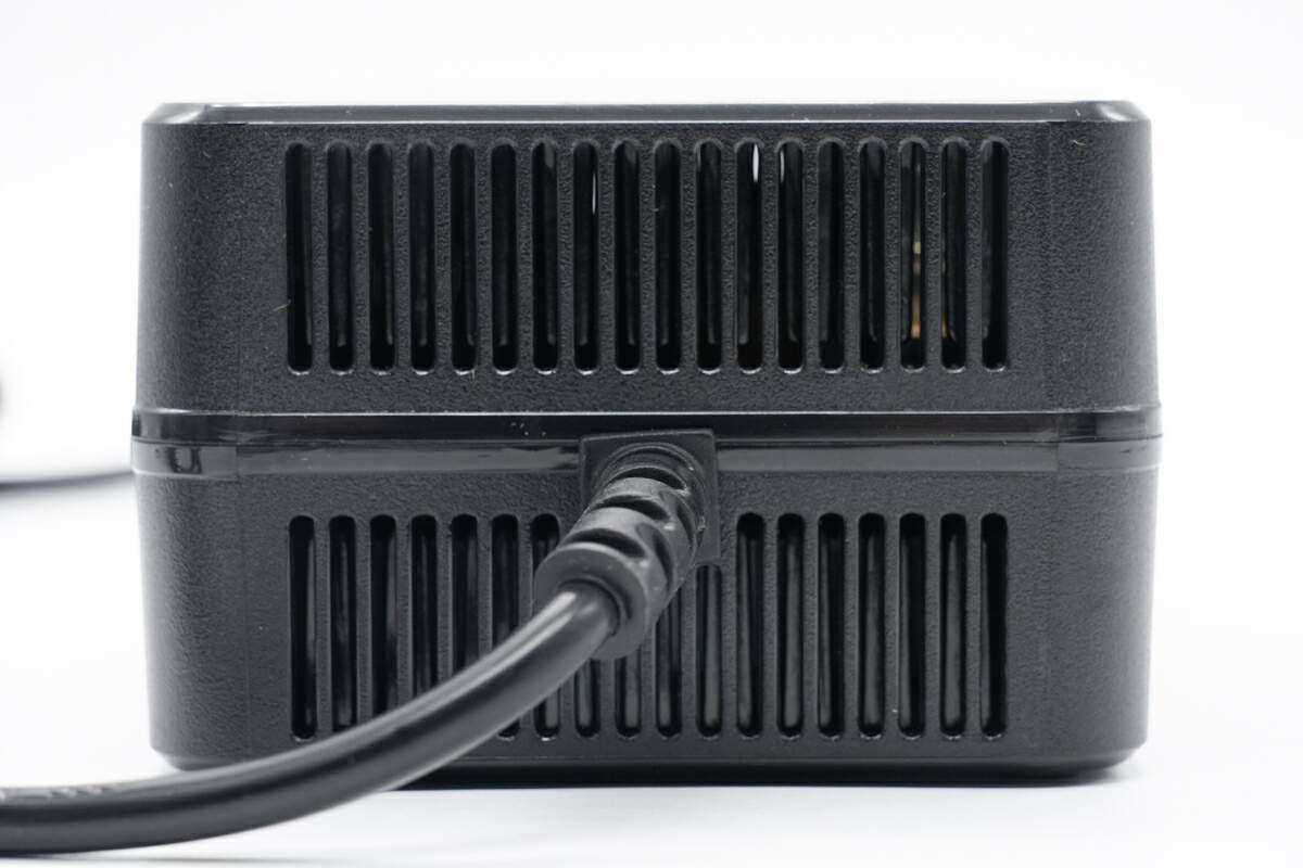 这款充电器具备1米长输入线和输出线,方便日常使用,还配有LED指示灯用于指示充电状态,内置的散热风扇能够及时将机身发热排出,确保稳定运行。下面充电头网就带来这款铅酸电池充电器的拆解,一起看看内部的设计和用料。