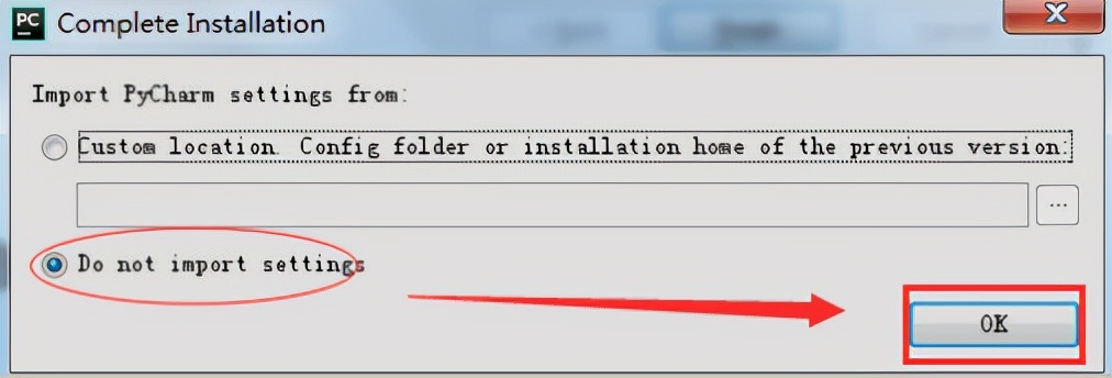 步骤1、双击运行安装好后放在桌面上的PyCharm图标,进入下图界面:选择“Do not import settings”,之后选择OK,进入下一步操作: