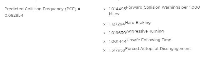 5个机器测量的数据带入特斯拉给出的公式计算,得到的预估未来发生事故概率PCF就是该驾驶员的潜在出事概率。