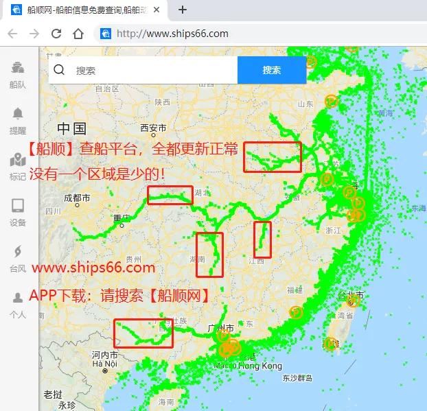 从船顺平台上获取的船舶绿点分布图中,我们可以看到,别人不更新的区域,它都还在正常更新!