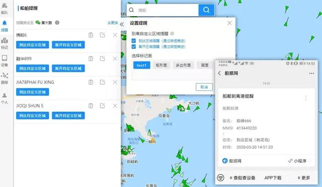 自定义设置监控区域,船只靠近监控区域时自动告警,并通过手机提醒工作人员处理。
