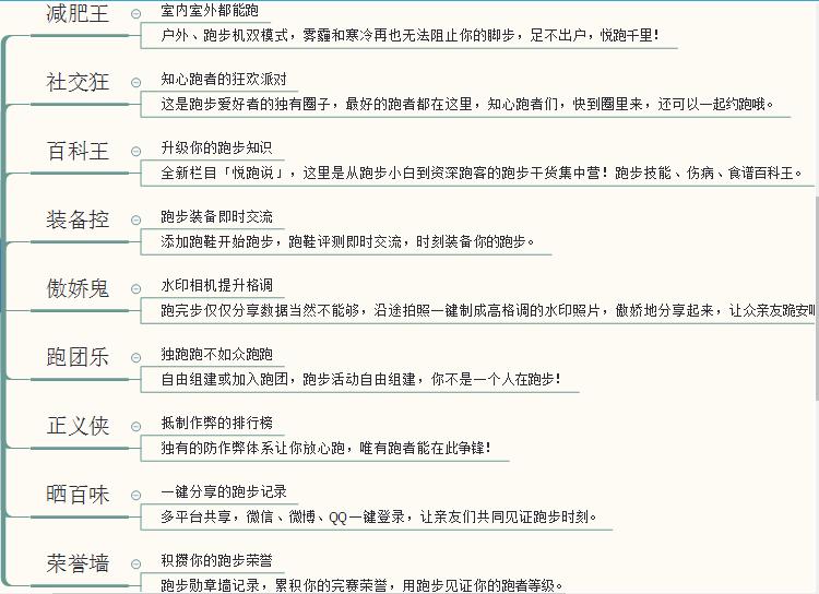 关于这一点我不仅仅说是社交功能是有原因的。用户的激励机制不止是社交分享,还有内心的对自己的肯定,在gamification里面,游戏的设计吸引用户持续玩下去的理由就是不断获得成就的快感,悦跑圈的用户个人激励机制充分满足了用户的心理需求,并且全方面而持续,不会说这种正向的反馈很难拿到或者一开始很容易得到后面就很少了。