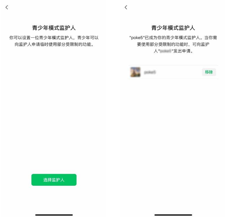 开启微信青少年模式之后,用户可绑定微信青少年模式的监护人,未成年人可向监护人发起特定公众号文章、小程序、链接临时访问申请,以及延长视频号使用时间的临时申请,监护人可远程通过个人微信账号进行同意授权。