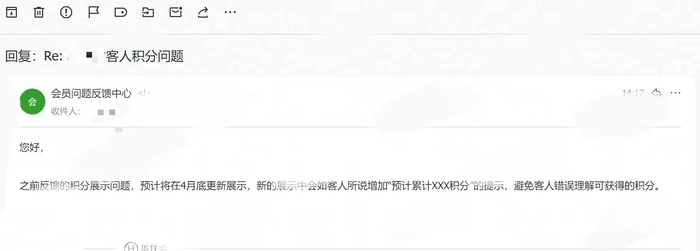 王一提供的回复邮件显示,华住会会员问题反馈中心对于积分问题曾表示,“预计将在4月底更新展示,新的展示中会如客人所说增加‘预计累计XXX积分’的提示,避免客人错误理解可获得的积分。”