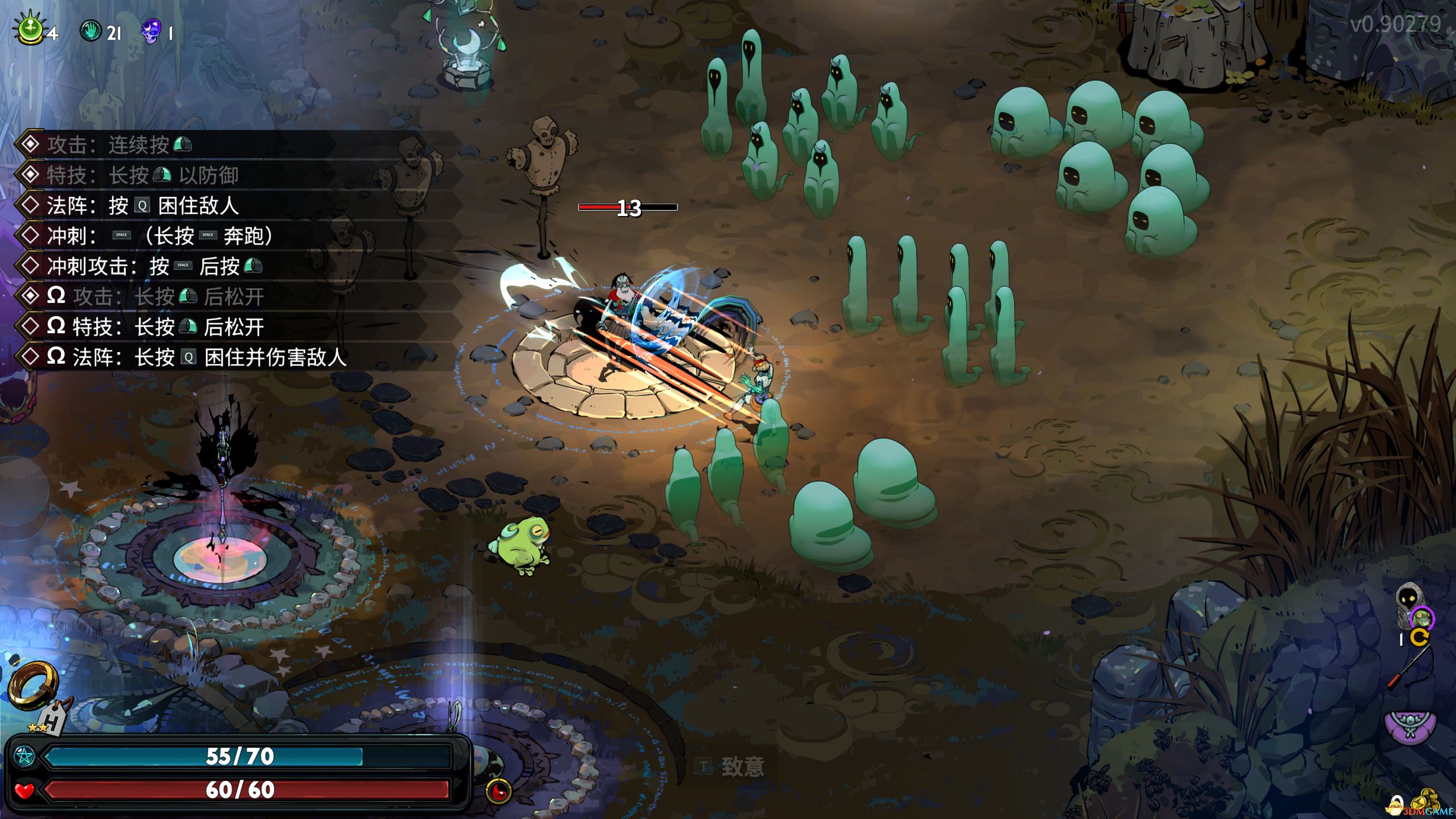 在攻击和特技命中21次后,获得静谧(一切事物减速)。