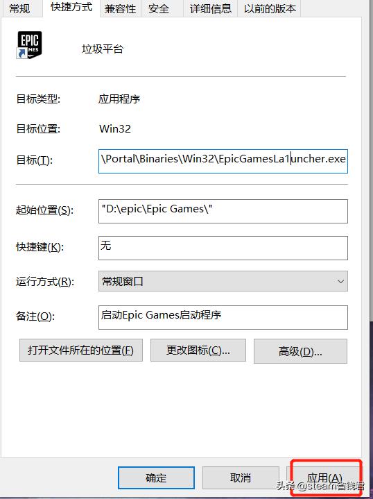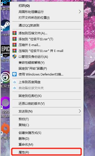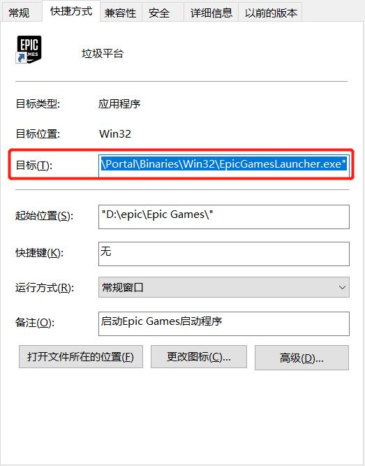 - 完全退出Epic客户端,右键单击Epic客户端的快捷方式,选择“属性”。