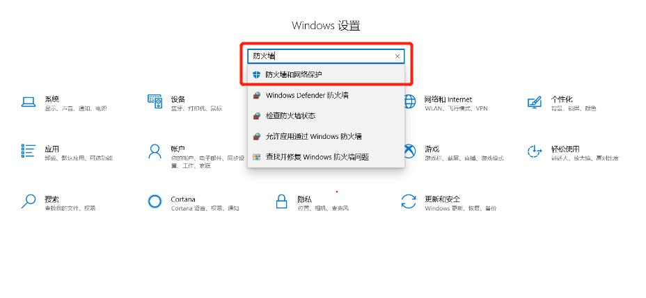- 进入设置页面,搜索“防火墙”,选择“选择防火墙和网络保护”。