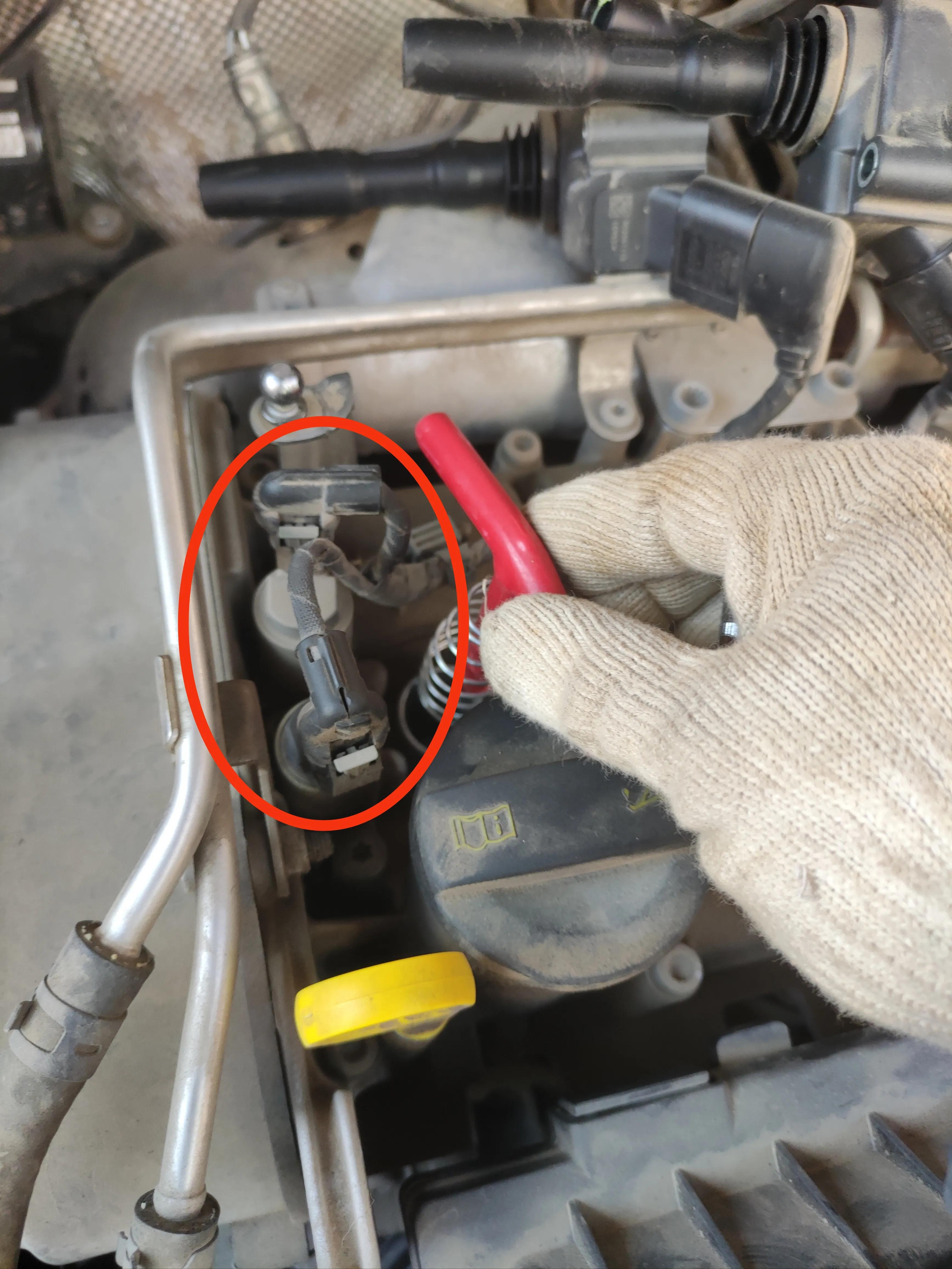 然后就是挨个儿把点火线圈儿拔出来,这个是橡胶的,不需要用太大的力,注意拔的时候别把线束扯断了。我看网上有人说需要把点火线圈的插头拆开,我试了一下,不用拆电缆插头,直接拔出点火线圈就可以。