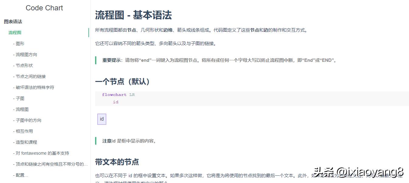 T、B、L、T分别是Top/Bottom/Left/Right的缩写 id为节点的唯一标识,类似于变量。括号内为节点要显示的文字 单向箭头为流程进行方向。支持虚线与实线,有箭头与无箭头、有文字与无文字。分别是---、-.-、 -->、-.->、--文字-->、-.文字.->、--文字---、-.文字.- 支持子图。如代码、效果图所示。