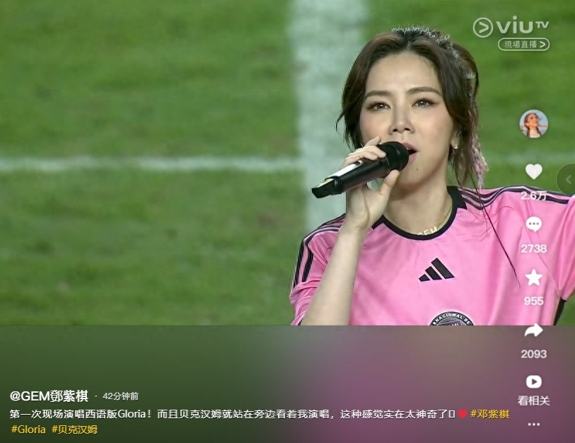 邓紫棋赛后发文:第一次现场演唱西语版Gloria! 而且贝克汉姆就站在旁边看着我演唱,这种感觉实在太神奇了。