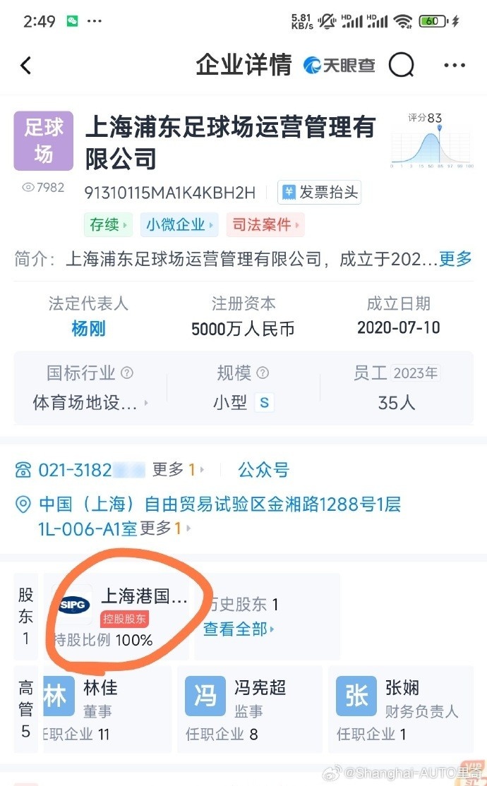 直播吧11月14日讯 博主“Shanghai-AUTO里奇”更新微博,根据天眼查信息,上港集团拥有上汽浦东足球场100%股权。