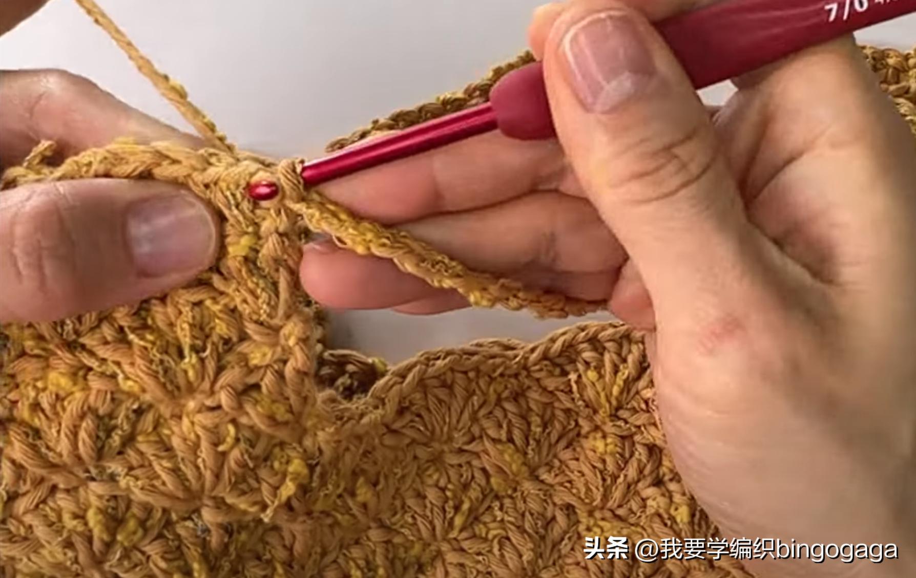 后面就重复这样的规律钩到所需的高度(示范款钩到了16圈),然后断线。接着我们从图示位置入针,开始钩包带部分。第1圈:入针处先钩1短(5长中心针),后面的短针上钩5长,5长的中心针上钩短针,再下个短针上钩3长3锁,在后面5长中心针上钩1短7锁,再在下个5长中心针上钩1短7锁,再到下个5长中心针上钩1短3锁,在下个短针上钩3长,再到下个5长中心针上钩短针,短针上钩5长,5长中心针上钩短针。