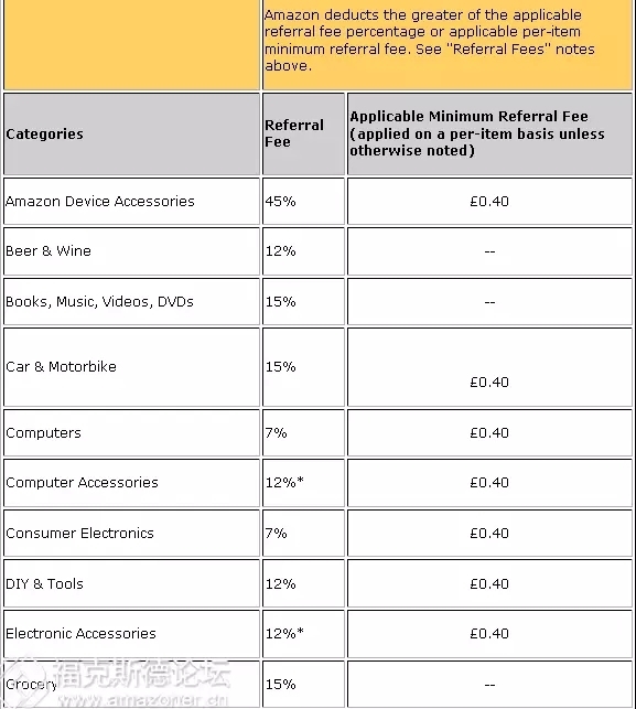 就可以看到具体的产品佣金的收费标准,各个类目的佣金比例和最低的收费标准。以下是英国站产品佣金的收费标准,查询的方法也是一样的,具体如下: