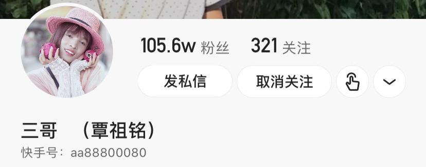 “三哥 (覃祖铭)”是今年7月20号左右改的账号名,以前叫过“广西铭哥”、“铭哥 (覃祖铭)”、“铭姐”等多个名称。