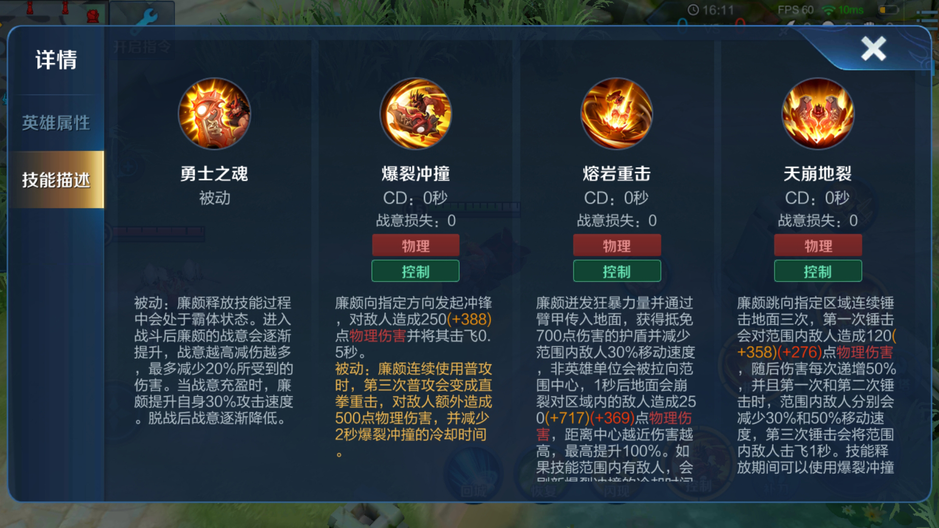 被动:廉颇释放技能是处于霸体状态的,并且进入战斗状态后战意会逐渐有提升,战意就是红色的能量条,越高减伤就越高,红色时就是满了,之后就会逐渐下降战意值。