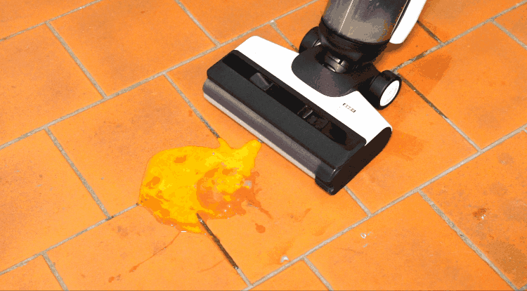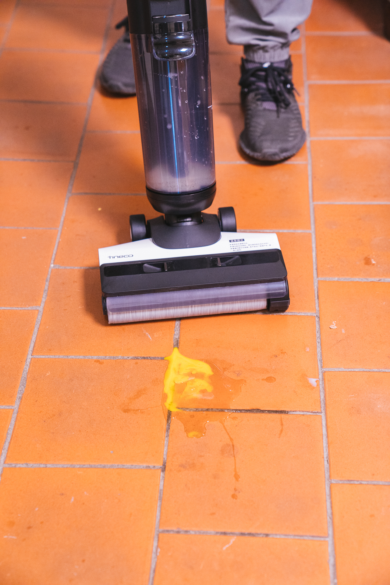 使用洗地机,立马一用就看到效果,直接把鸡蛋液吸附到滚刷上,然后进入污水箱中!吸走鸡蛋液的同时,还会使用一部分清水把地面和滚刷都清洁干净,避免形成普通拖把那样越拖越脏的问题。添可 芙万2.0可以一次清洁干净这个粘稠的鸡蛋,以后厨房再打碎鸡蛋也不用担心了。