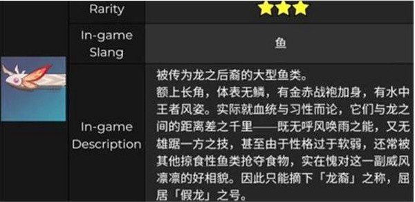 额上长角,体表无鳞,有金赤战袍加身,有水中王者风姿。实际就血统与习性而论,它们与龙之间的距离差之千里——既无呼风唤雨之能,又无雄踞一方之技,甚至由于性格过于软弱,还常被其他掠食性鱼类抢夺食物,实在愧对这一副威风凛凛的好相貌。因此只能摘下「龙裔」之称,屈居「假龙」之号。