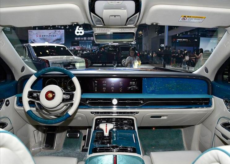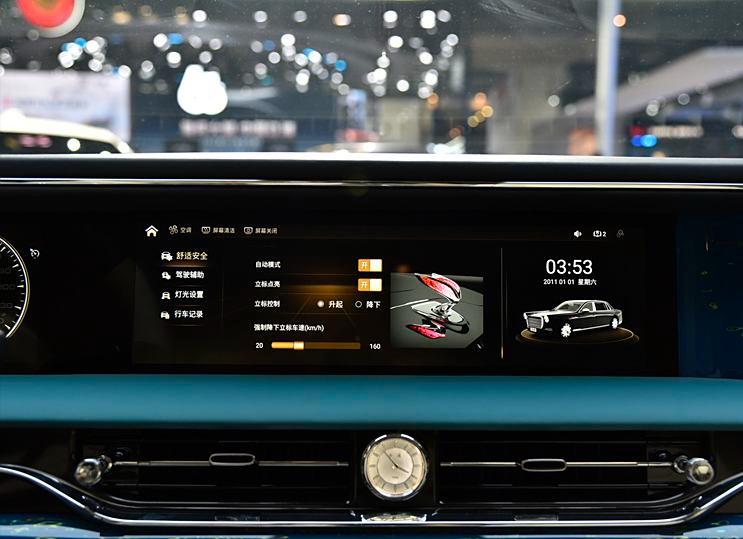 内饰方面,采用平直的贯穿式中控台设计,内部包含全液晶仪表盘和大尺寸的中控屏,中控面板注重装饰的营造,采用中华非遗的大漆及刺绣工艺,空调出风口中央有石英钟设置。整个方向盘也是复古风格,包括下部经典的镀铬装饰。变速挡把周围区域,布置了大量的控制按键,方便驾驶员随时可以快捷操作。
