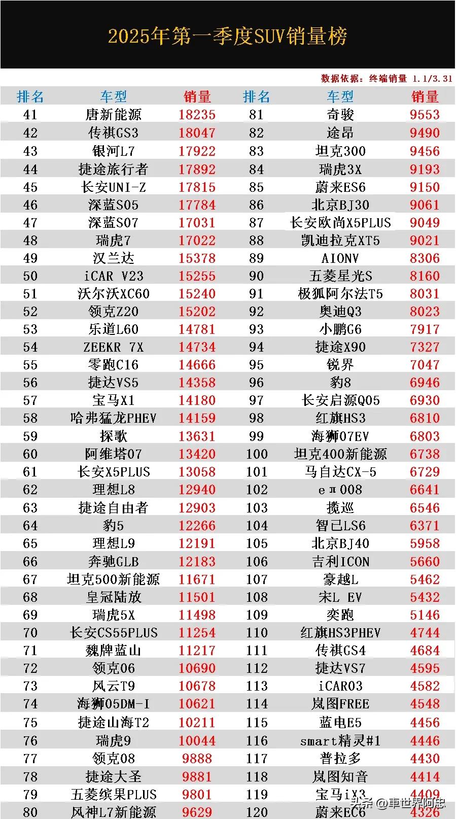 大洗牌!2025年第一季度SUV销量榜,国产前十占七,本田CRV第13!