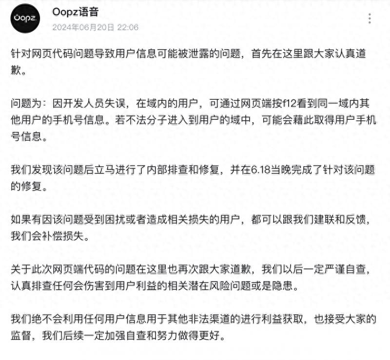 游戏语音服务软件Oopz语音近日发布声明,称对于公司产品存在的泄露用户隐私问题已进行内部排查,并在6月18日当晚完成了针对该问题的修复。Oopz语音表示,该问题因开发人员失误导致,对此次事故给用户带来的困扰致歉,同时会对给用户造成的相关损失给予补偿。