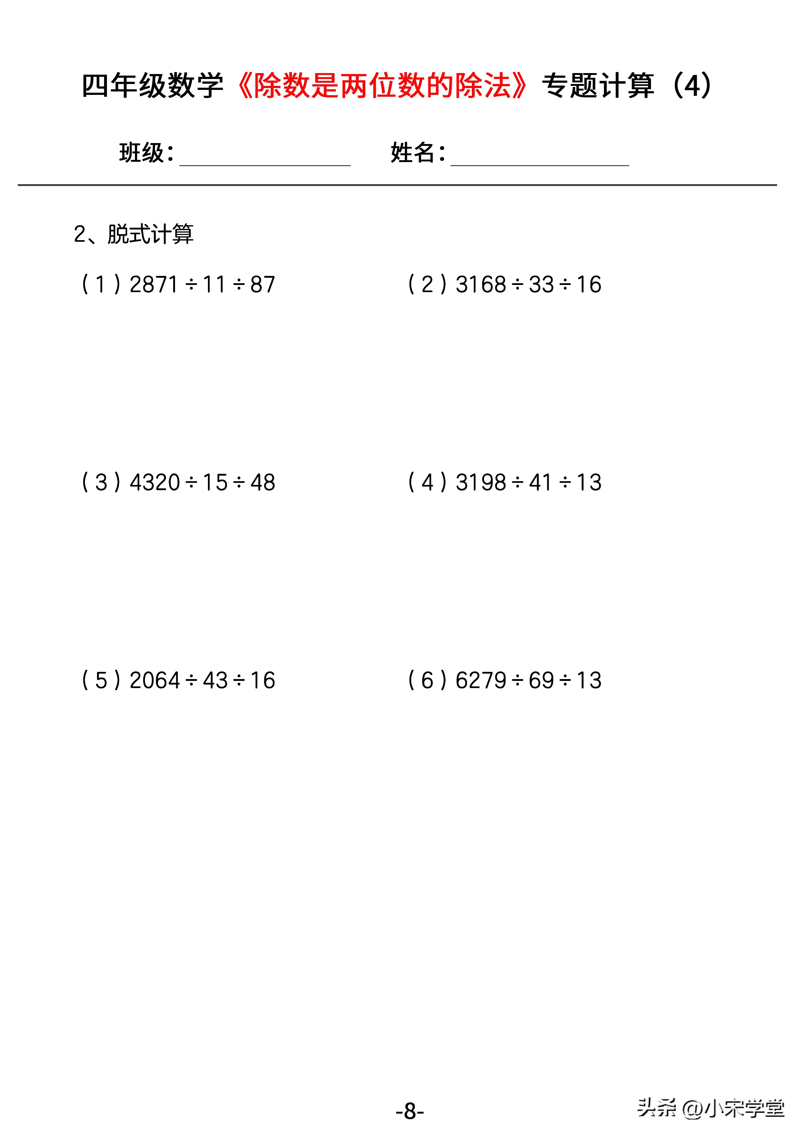 除数是两位数的除法,是本学期四年级的一个重点单元,多个版本在数学考试中都会遇到。它在人教版中是属于第六单元的知识内容,涉及的试题也多样。这里主要以计算题为练习目的,练习卷分为5套。口算在第1套中,脱式和竖式的相关计算题也囊括在内。详情如下: