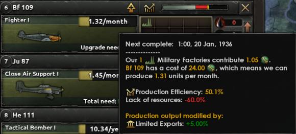 每个军工厂的基础产出是5点,下图中战斗机的生产效率是50.1%,限制出口的政策+5%