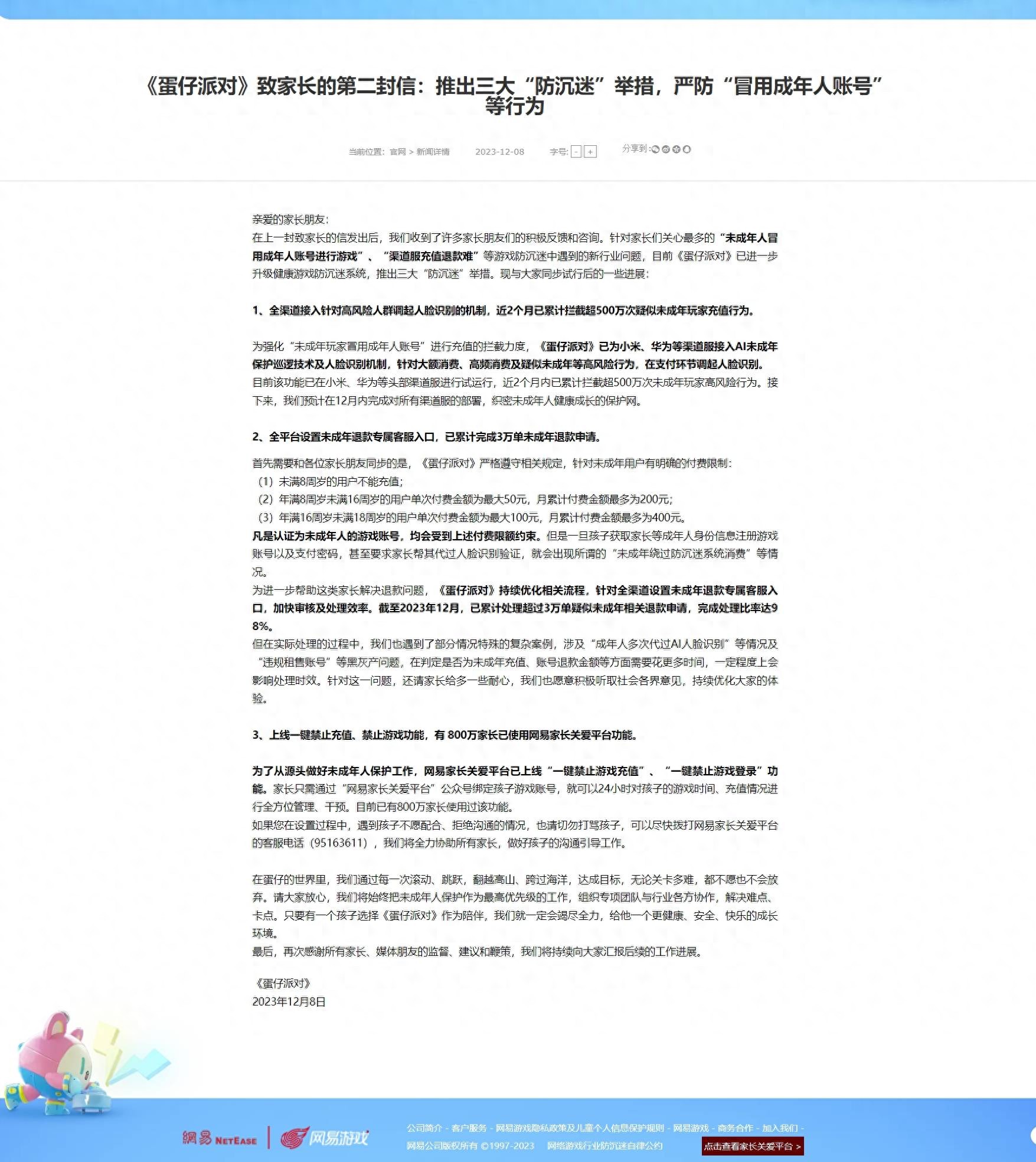 此外,《蛋仔派对》已上线“一键禁止游戏充值”、“一键禁止游戏登录”功能,以从源头做好未成年人保护工作。家长只需通过“网易家长关爱平台”公众号绑定孩子游戏账号,即可24小时对孩子的游戏时间、充值情况进行全方位管理、干预。官方数据统计,目前有800万家长使用了网易家长关爱平台功能。