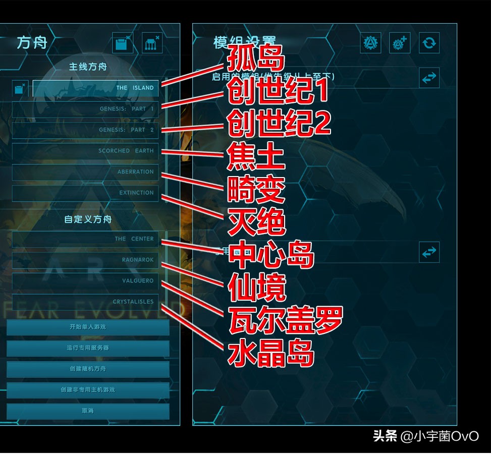 小伙伴们在想要去新地图开荒,去尝试养成新种类的恐龙的时候。却发现,地图的入口全是英文的。根本就找不到哪条英文对照的是哪个地图,完全就是一抓瞎。
