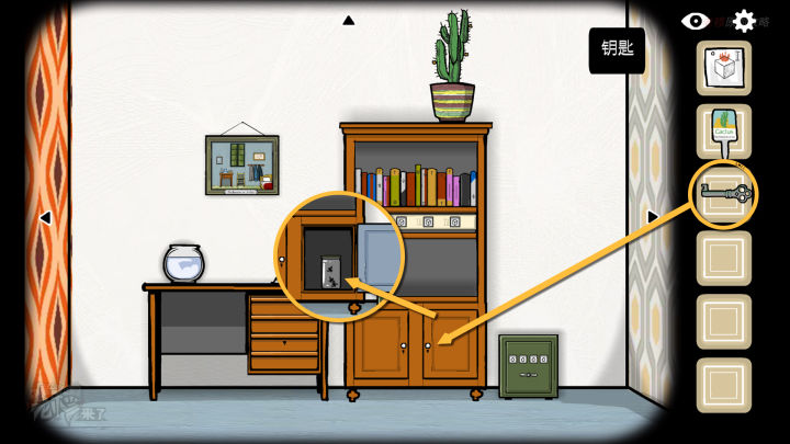 书柜视角:用【钥匙】打开书柜右侧的【柜门】,拾取【苍蝇】