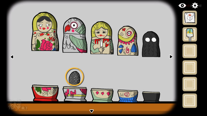 书柜视角:打开【持刀套娃】,取出【鸟蛋】,并将其放入到【鸟形套娃】中