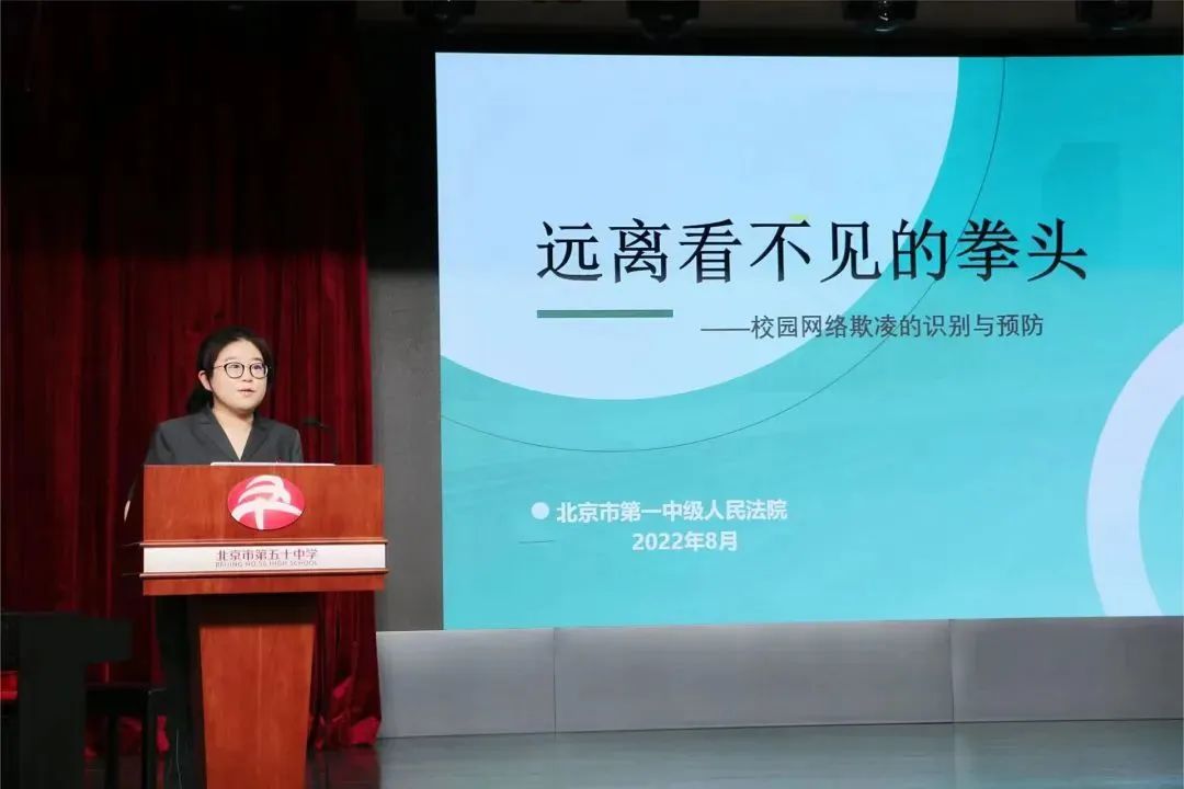 北京一中院未审庭走进北京市第五十中学,法官助理郝孟琦为2022级300余名初一年级新生讲授了题为“拒绝欺凌 守护少年的你”的法治课,她结合小升初学生的心理特点,通过案例讲解、观看反校园欺凌微电影及普法宣传短片等多种方式,从校园欺凌是什么、校园欺凌的表现形式及危害、如何应对和远离校园欺凌三个方面进行讲解。