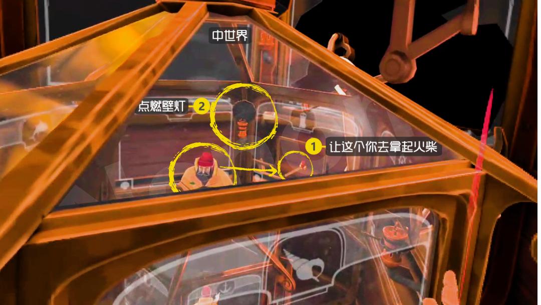 好在中世界的灯不需要你再调整光照方向。所以用这种方法点燃中世界的三盏灯吧。点完后记得把火柴放到窗口1上。