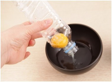第三步:瓶口朝下,轻捏瓶身,释放空气,再对准蛋黄,利用压力差,将蛋黄压入空瓶中,这样轻轻松松,一秒钟,就将蛋黄“吸”出来了!